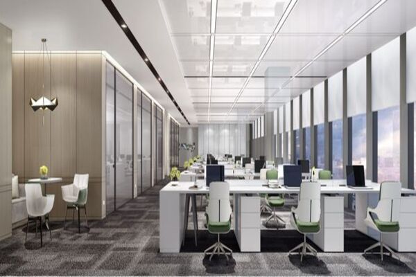 A modern office with 2500 sq. ft. carpet area, designed with open seating, conference room, reception, and cafeteria. Located in a Grade A building with ample parking and 24/7 security.